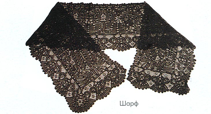 «Кремовыми и черными шелковыми шарфами и косынками славились балахнинские (Нижегородской губернии), кукарские (Вятской губернии), калязинские (Тверской губернии), елецкие (Орловской губернии), захожские, то есть киришские (Петербургской губернии), кирилловские (Новгородской губернии) кружевницы.
